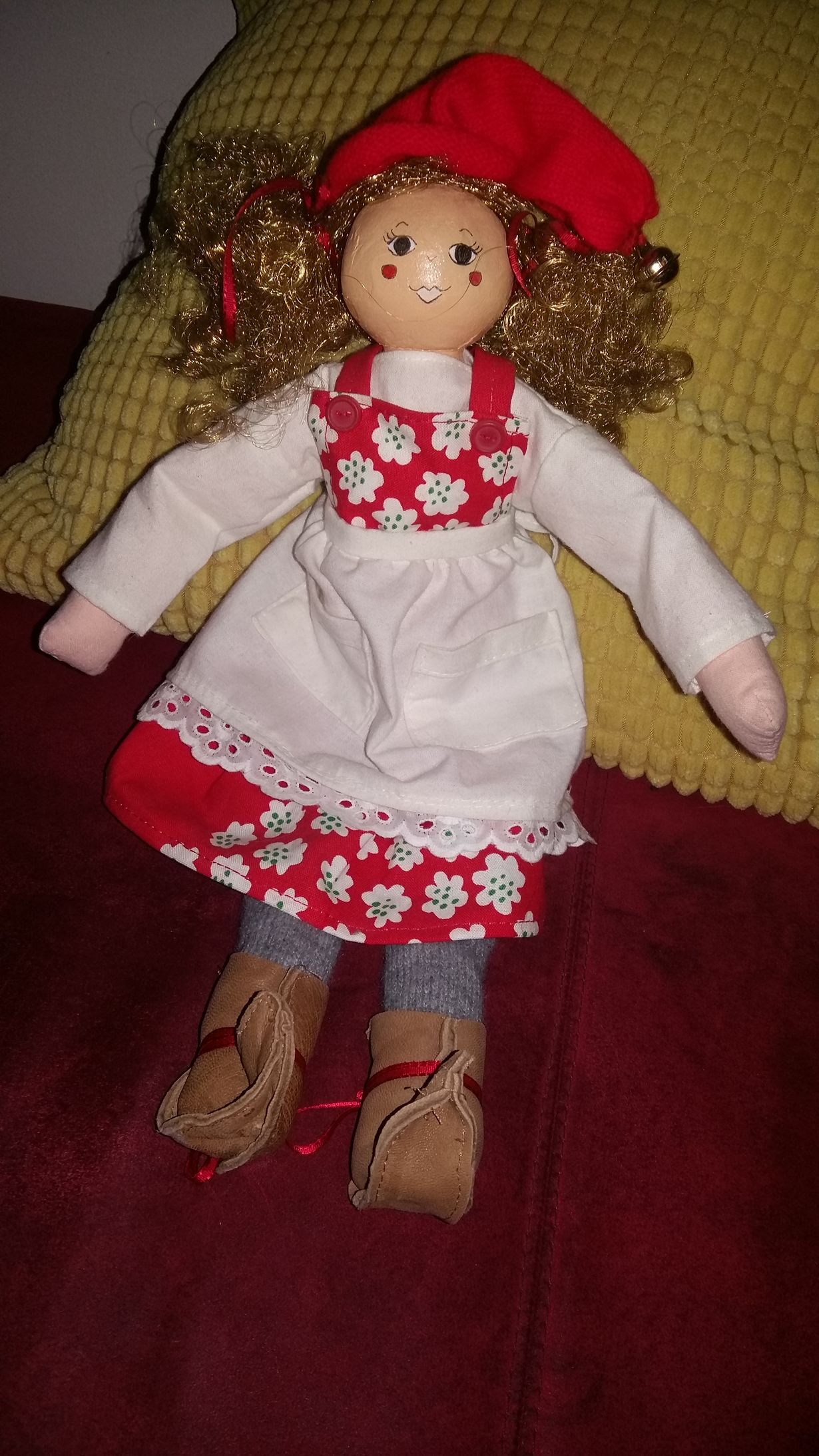 Äitini teki tämän tonttutytön ja minä maalasin sille kasvot. Se nostetaan aina joulun alla hyllyn reunalle.