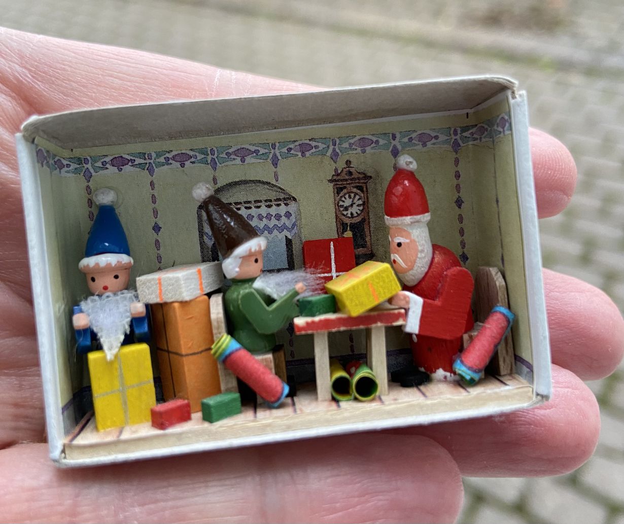 Lempijoulukoristeeni on hankittu vuosia sitten heinäkuussa joulukaupasta Berliinistä. Pikkuisessa tulitikkurasiassa on tonttujen paja.