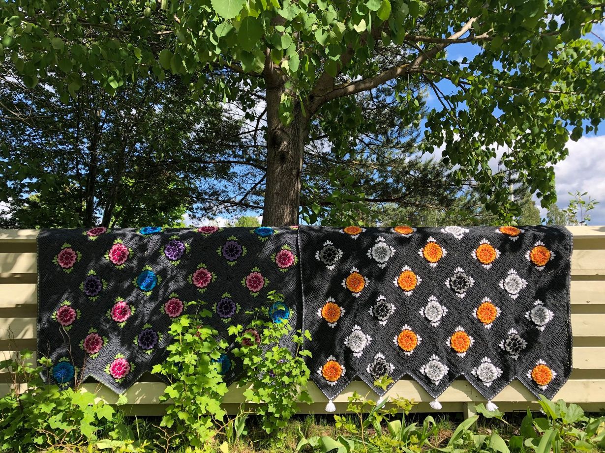 Virkkasin viime vuonna pikkusiskoille 50-vuotislahjaksi Caladriel-torkkupeitot heidän lempiväreissään.