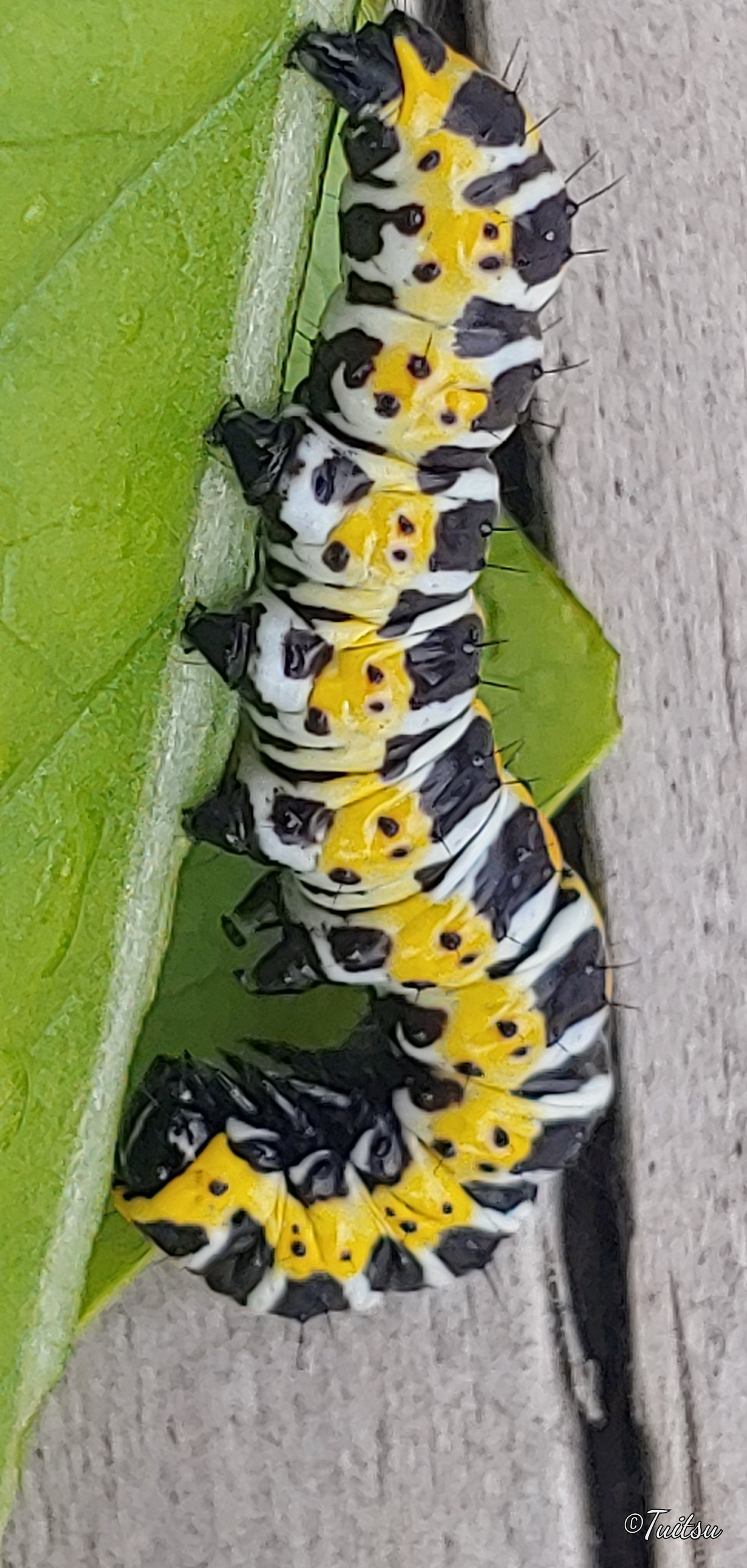 Puutarhastamme löytyi kesällä n 3 cm toukka, josta otin zoomaamalla kuvan. Vasta kuvaa katsoessa huomasin kauniin Pluton-naama kuosin.