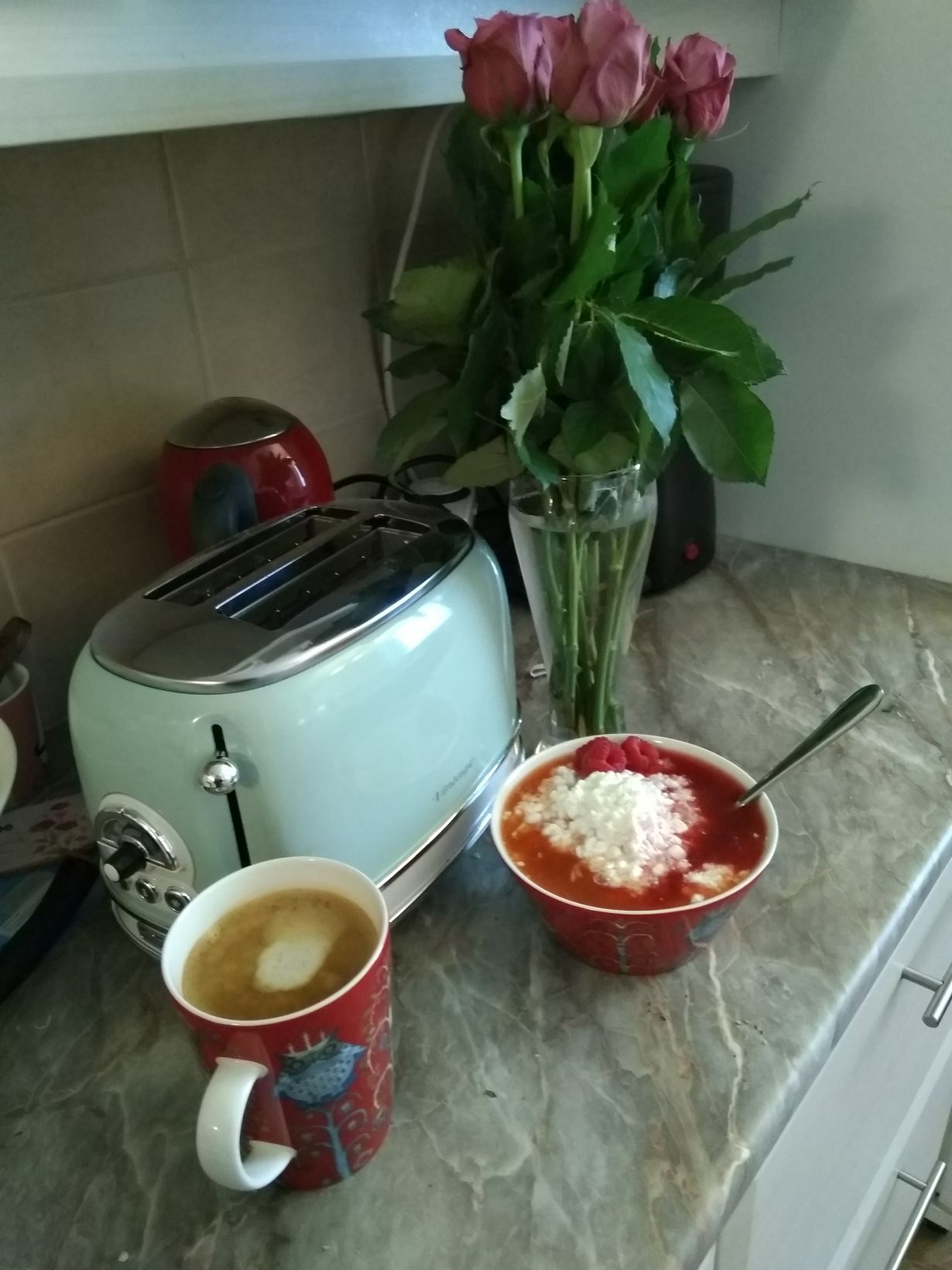 Tämän setin kun pistelee poskeensa niin päivä lähtee hienosti käyntiin aamulenkin jälkeen. Aamupala sisältää mustikoita, vadelmia, puuroa, mehukeittoa ja raejuustoa sekä ison maitokahvin, ihan parhautta!