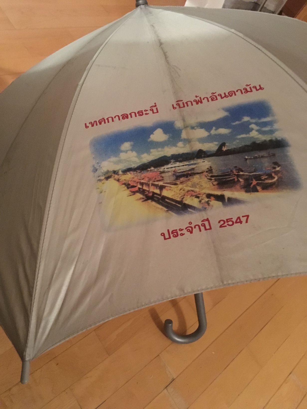 Sain varjon Thaimaassa krabilaisesta pankista tilin avaamisen kylkiäisenä joulukuussa 2004, juuri tsunamin alla. Olen vaalinut varjoa muistona tuosta ajasta, mutta on se ollut kovassa käytössäkin. Se pitää tuulet ja tuiskut, suojaa meidän omilta luonnonvoimilta.