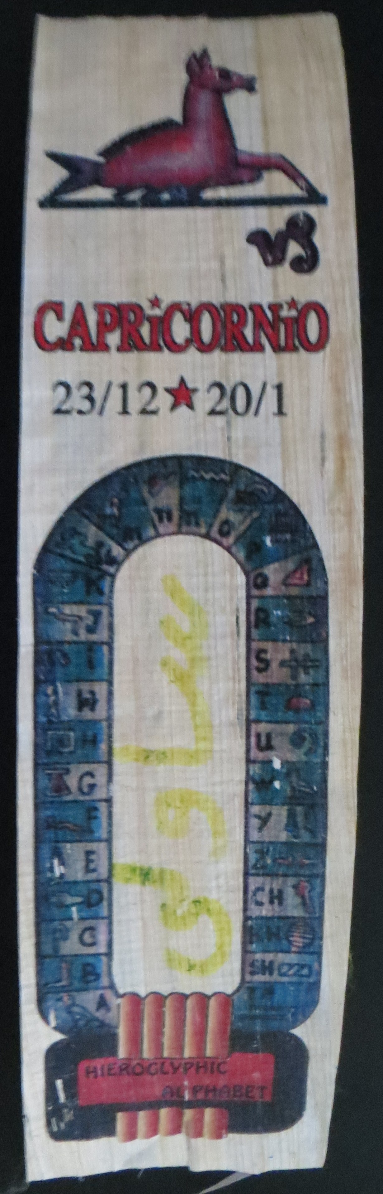 Seitsemäntoista vuotta sitten sain paikalliselta lahjatavaraliikkeen omistajalta hieroglyfeillä kirjaillun oman horoskooppiaiheisen kirjanmerkin muistoksi.