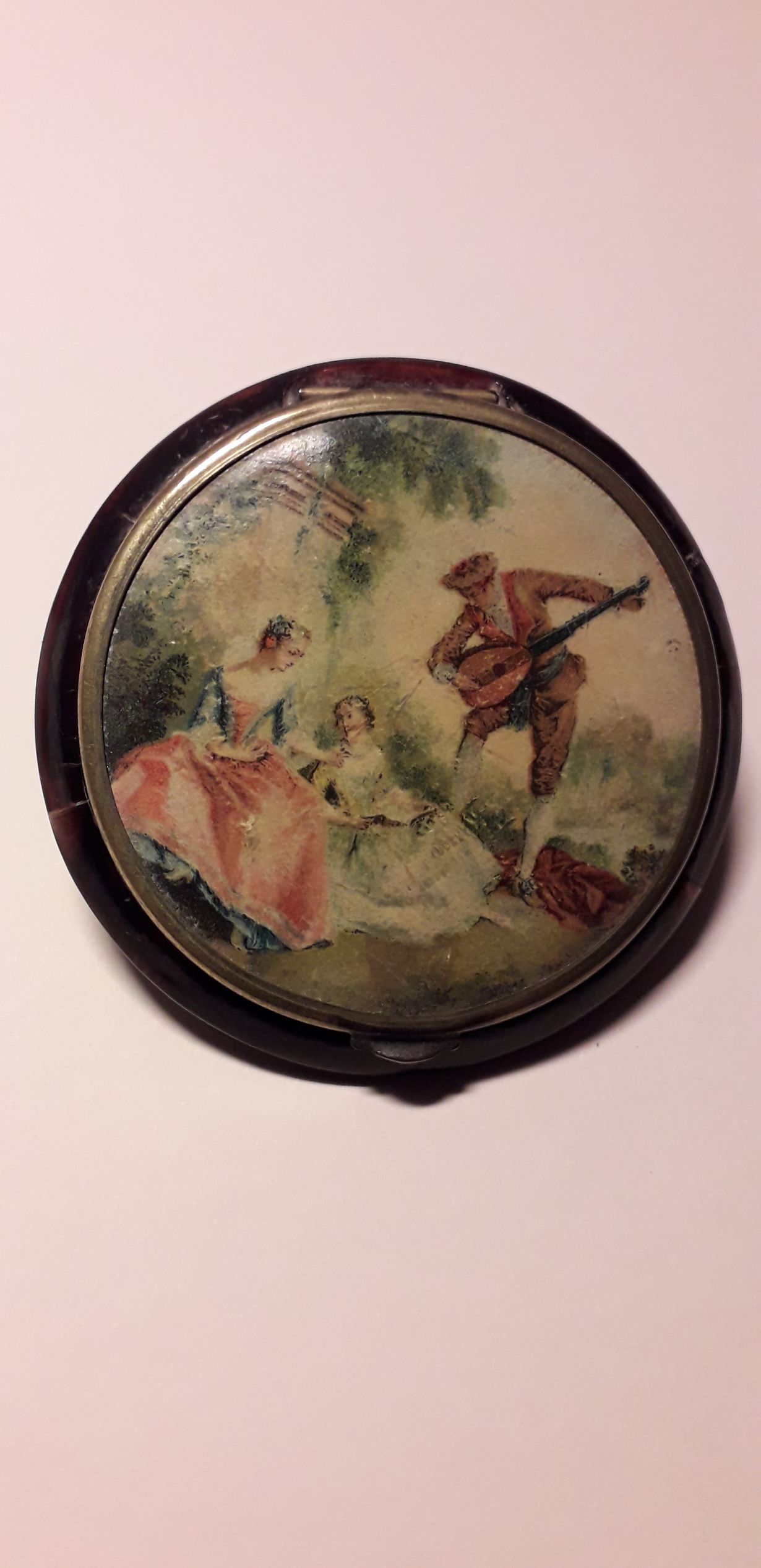 Isoisäni tuliaislahja isöäidilleni Pariisinmatkalta vuodelta 1900. Matkalla käytiin myös maailmannäyttelyssä. Rasia valmistettu pariisissa ja siinä on ilmeisesti ollut myös puuteri.