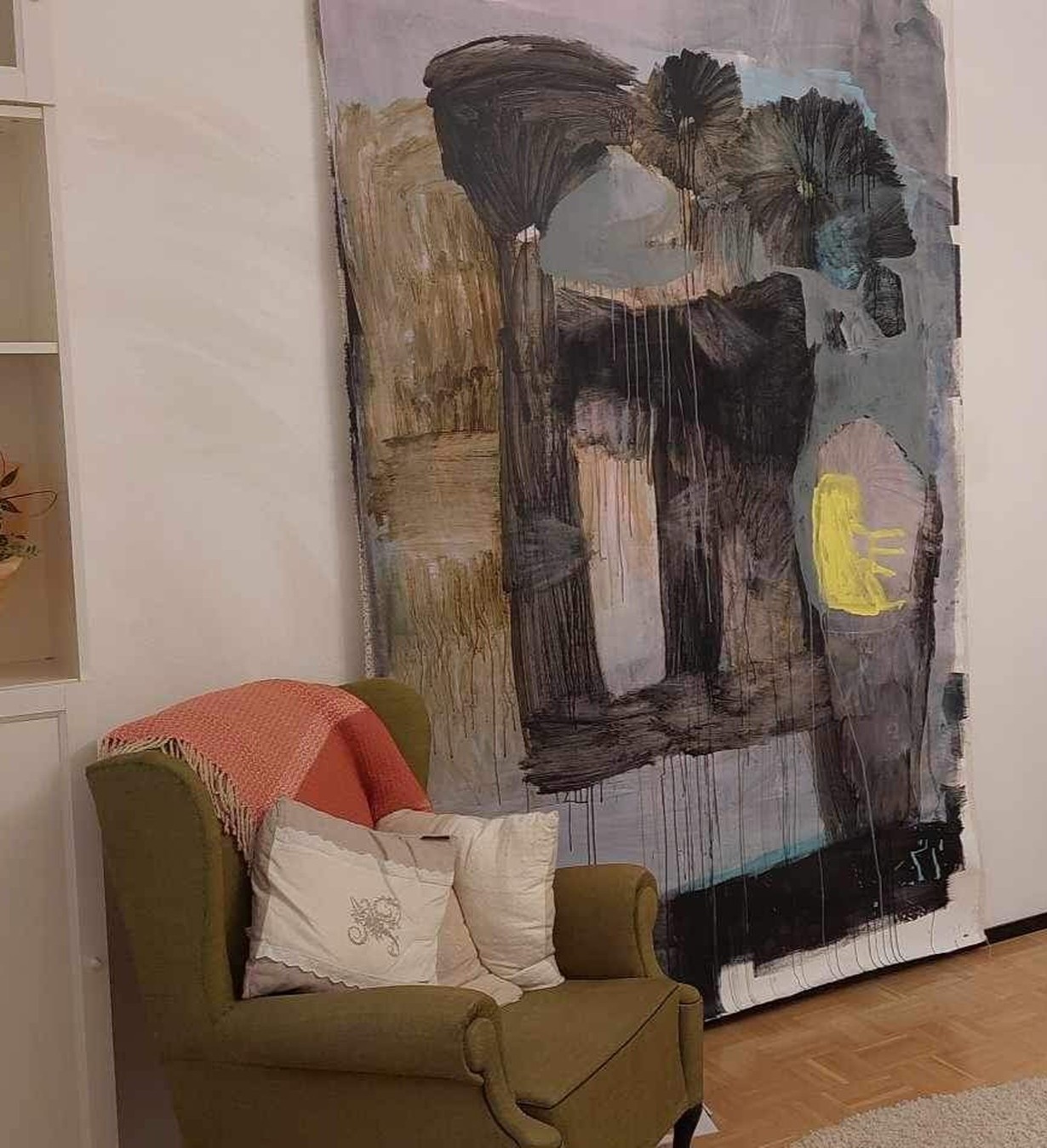 Hankin ison maalauksen sovitettavaksi luottotaiteilijalta, Mirja Ilkalta näkemättä edes kuvaa. Maalaus vaikuttaa aluksi synkältä, mutta lähempää katsottuna siinä on paljon värejä ja sävyjä. Synkkyydestä pistää esiin terävä keltainen. Taustalla on kepeitä sävyjä. Tauluun on helppo sijoittaa työn ja arjen tunnelmat. Keltainen toivon väri loistaa joka päivään!