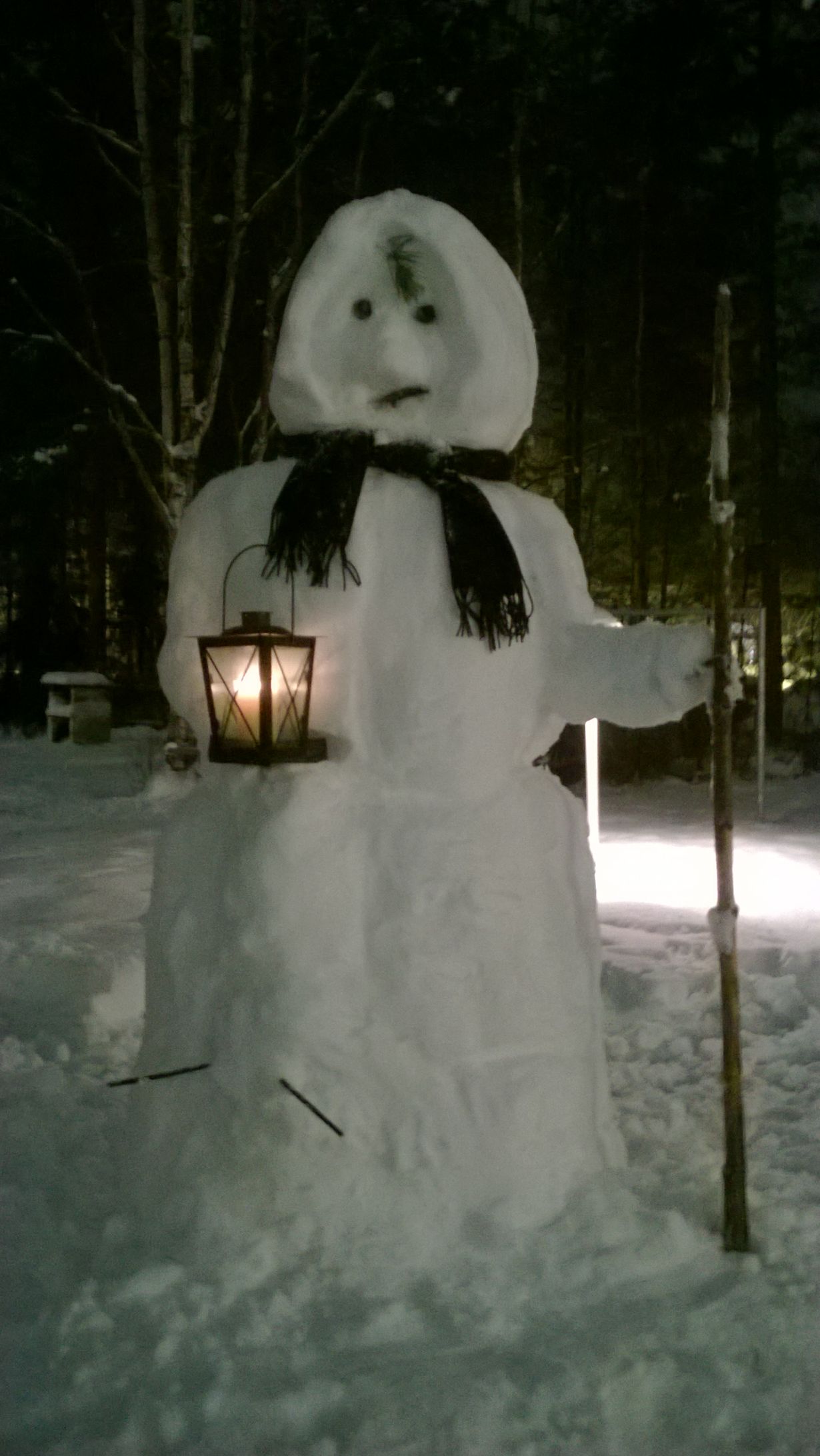 Pari talvea sitten pyysin talon miestä ja poikaa tekemään meille itseni näköisen lumiukon. Tämmöinen "matami" sinne takapihalle ilmestyi. :)