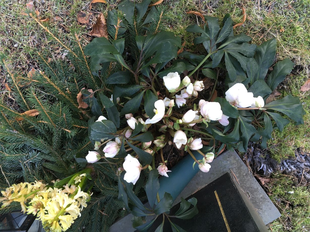 Poikkesin vanhempieni haudalla Turussa 4.2. Naapurihaudalla oli komea valkoinen jouluruusu - tekokasvi ajattelin. Oli pakko käydä kokeilemassa, oikea oli ja sillä hetkellä jäässä!