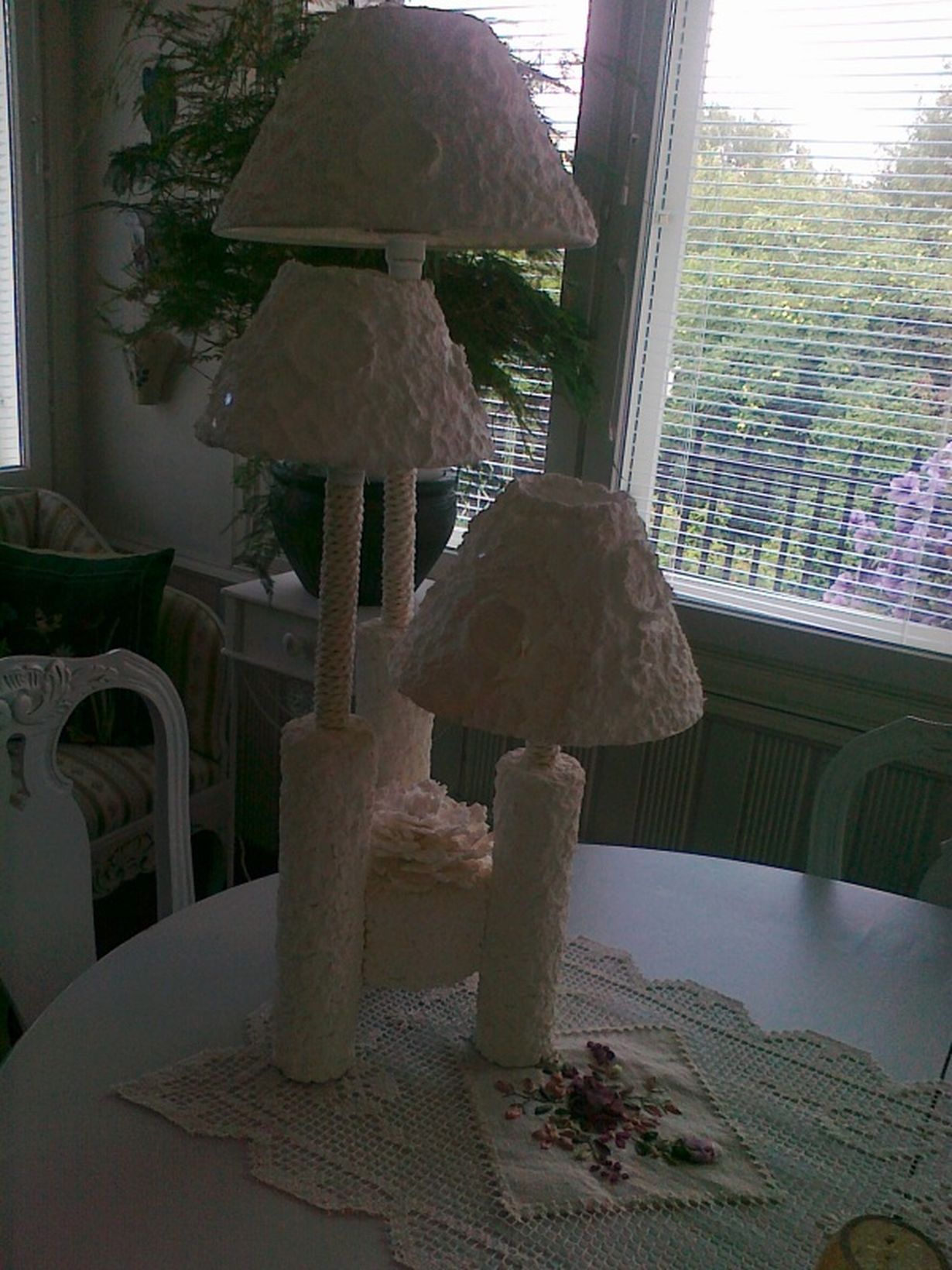 Itse paperimassalla päällystetty metallinen pöytälamppu. Tuunauksen jälkeen on saanut paljon ihailuita osakseen. Sen lisäksi, että ilahduttaa omistajaansa lasikuistin pöydällä.