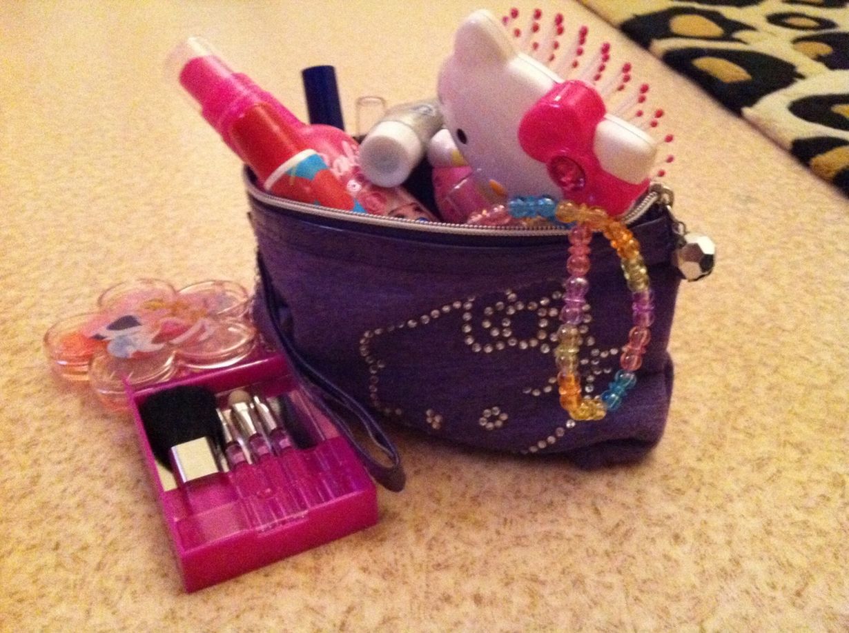5-vuotias tyttäreni on aina kiinnostunut meikeistä ja ihaillut tätinsä meikkejä. Kyseinen täti yllättikin pikku neidin tuoden Lontoon tuliaisina Prinsessameikkejä. Aamuisin harjataan hiukset HelloKitty harjalla ja laitetaan huulikiiltoa.