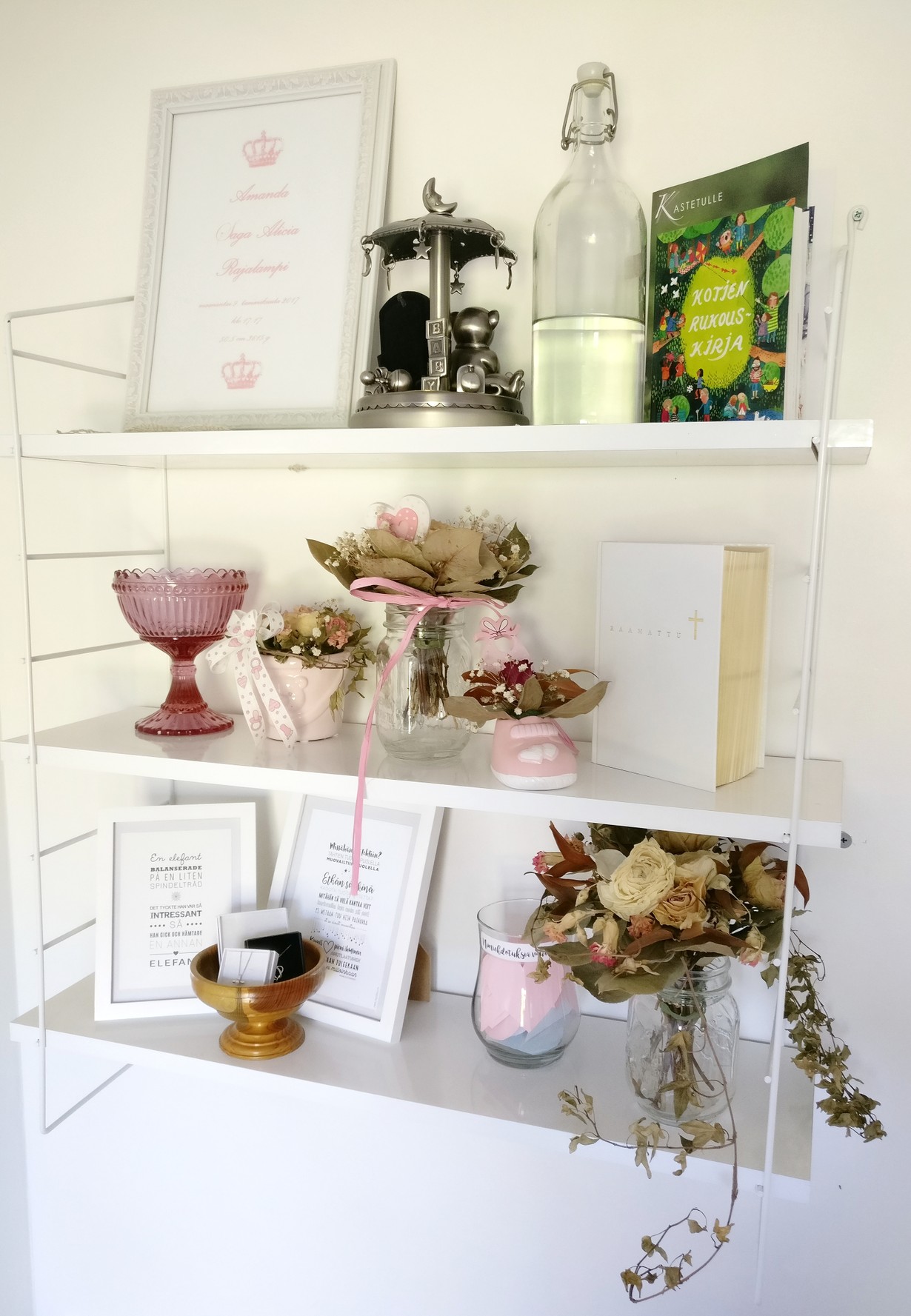 Hyllylle kerätty kaikkea raskausajasta lapsiarkeen - babyshowereiden nimiehdotuksia vauvalle lasipurkissa (voittajalle taitaakin olla vielä skumpat tarjoamatta!), synnärille tuodut kukat, ristiäiskukat, korut ja taulut. Hylly täynnä rakkautta eri muodoissa.