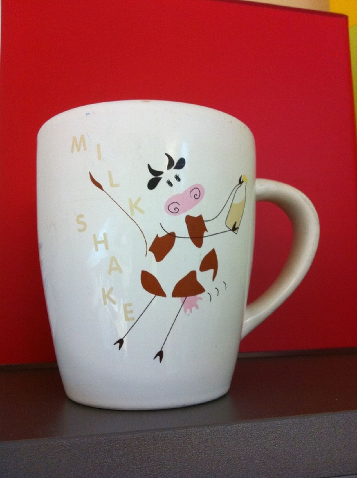 Tämä kuppi oli alun perin työkaverini Piian ja minä ihailin sitä jo silloin, sen ison koon vuoksi. Kun Piia jäi äitiyslomalle, unohti hän kupin toimistolle ja niinpä kuppi vaihtoikin käyttäjäänsä. Tämä kuppi ei ole mitenkään erikoinen kuvaltaan, mutta sen koko tekee siitä ihanan! Valmistan siinä aamuisin cafe lattea. Ison koon vuoksi mukaan mahtuu niin kahvi, vanilja-makusiirappi kuin myös ruhtinaallinen määrä maitoa ja maitovaahtoa. Pia on tällä välin palannut äitiyslomaltaan ja tunnustinkin hänelle heti että kuppi on ollut ahkerassa käytössäni. Kyselinkin ei kai hän nyt vaan halua rakasta "kuppiani" takaisin. Piia kuitenkin totesi: "Pidä hyvänäsi, toin sen töihin juuri siksi, että se oli mielestäni epäkäytännöllisen iso". Toisen romu – toisen aarre! :)