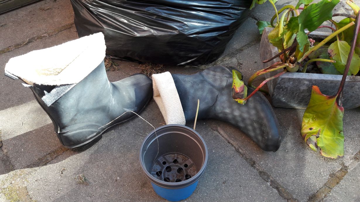 Ostin nämä saappaat kirpputorilta muutamalla eurolla. Silloin ne olivat siistit, nyt vanhat ja hapertuneet kuten käyttäjänsäkin. Yhdessä olemme kulkeneet mustikka- ja sieniretkillä - puhumattakaan puutarhatöistä. Öisillä käynneillä pihanperällä ne suojasivat kasteelta. Nyt ne lepäävät varastossa "hätävarana".