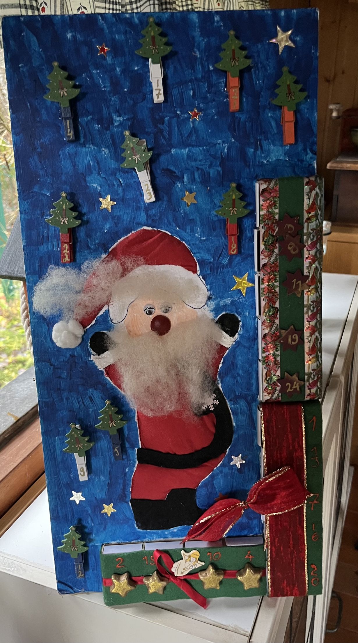Tutustuin aikoinaan Ranskassa askartelulevyyn, jonka keskellä on jotain pehmeää massaa. Kuvio tehdään tekemällä viiltoja arkkiin, ja sitten siihen upotetaan neulan kärjellä kangasta jonka alla hieman pehmustetta. Siitä tein tyttärelle joulukalenterin, ja lisäilin pyykkipoikia ja tulitikkurasioita pieniä lahjoja varten.