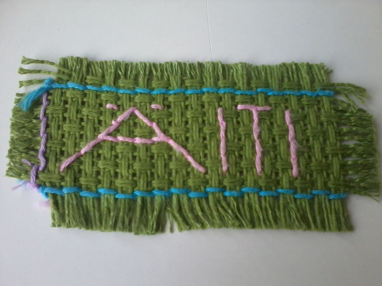 Tyttäreni teki tämän siistin työn varmaankin ala-asteella. Nyt hän on jo 23 vuotias, mutta kirjanmerkki on edelleen kovassa käytössä. Joskus siitä lähtee vihreitä lankoja irti mutta onnekseni se pysyy vielä kasassa!