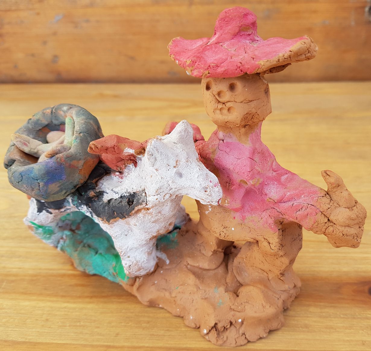 Puutarhuri jonka aasin selässä hedelmäkori. (Harmi etten muista oliko tytär 6 tai ehkä 7-vuotias kun hän askarteli tämän.)