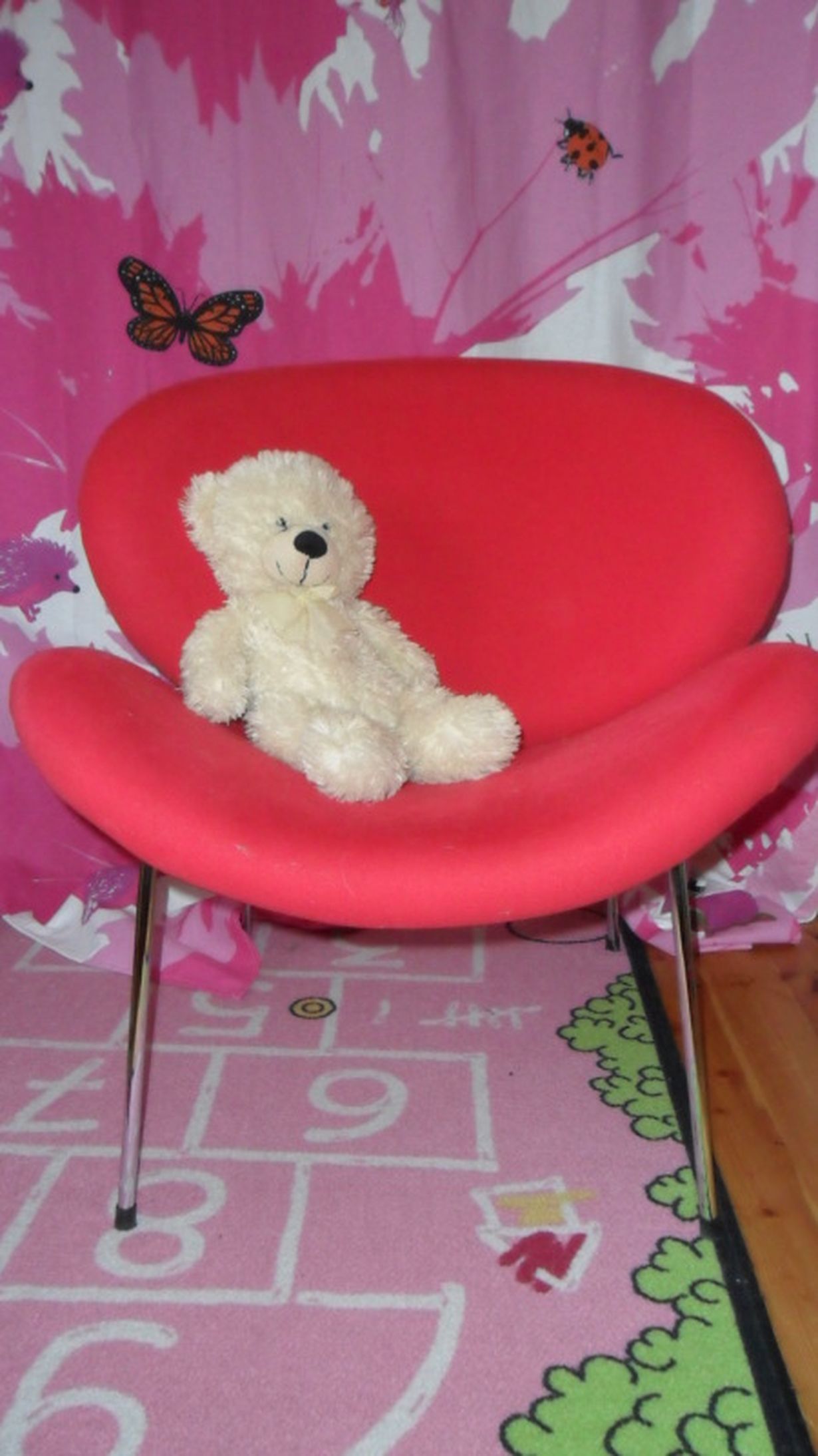 Karvoista huomaa että siinä viihtyy myös lemmikkikissa. Tuoli ostettiin aikoinaan mukavan muotonsa ja värinsä vuoksi eikä istumamukavuudessakaan moittimista ole, siinähän istutaan miten milloinkin. Se on lapsille tarkoitettu eikä kaadu ihan helpolla.