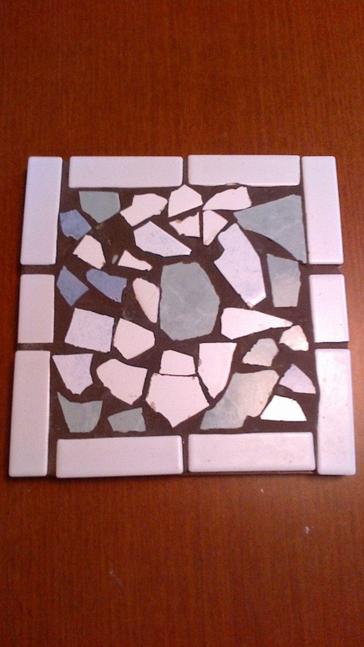 Rakastan tätä pannunalustaa! Ensinnäkin se on kaunis, mutta sitäkin suuremmalla syyllä, kun tyttärelläni on hahmotushäiriö ja muutenkin kädentaidot ovat hakusessa, niin hän on saanut tehtyä minulle tämän upean alustan! Pohjalla on vaneria ja kuviot on tehty rikotuista kaakelin palasista.