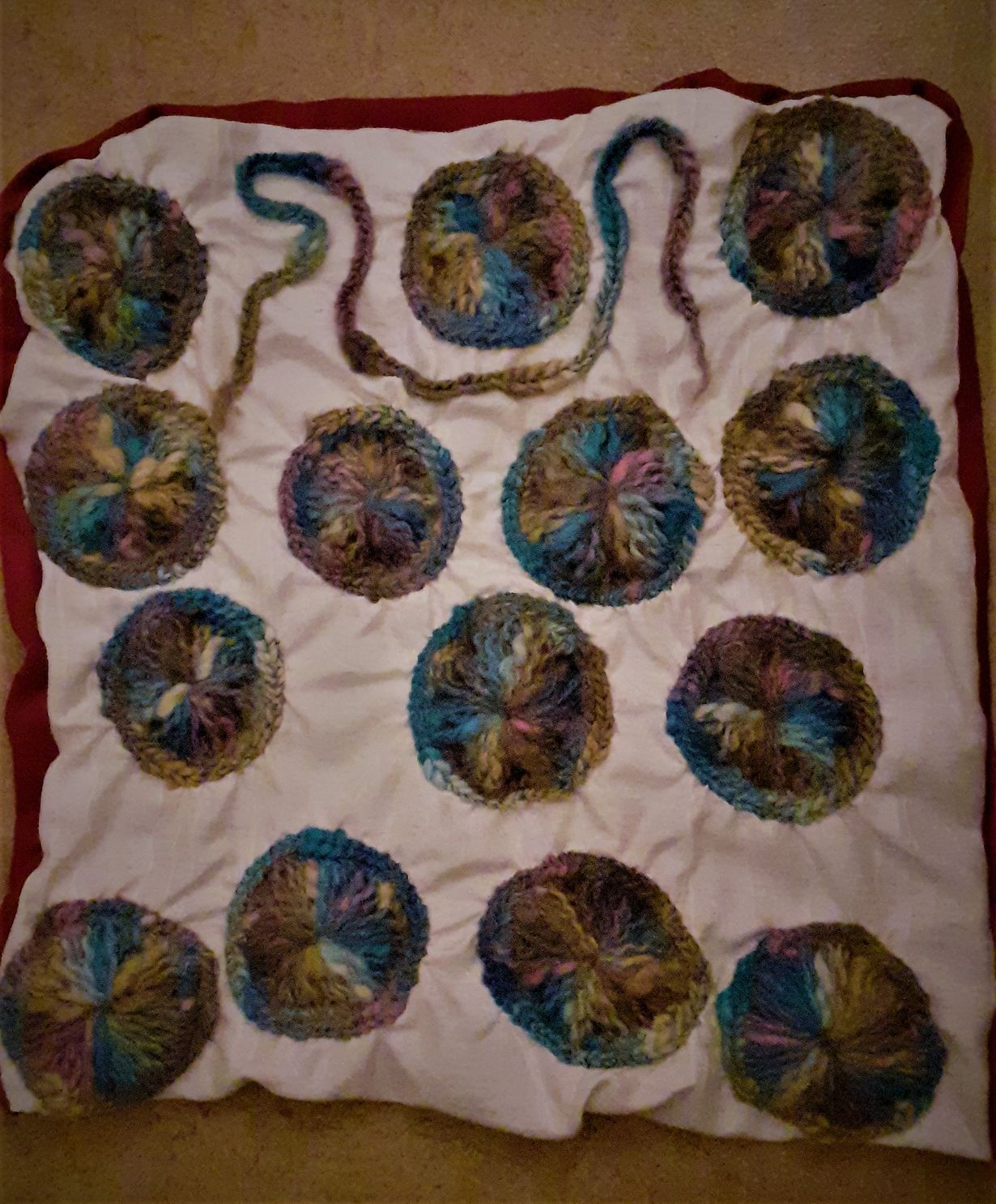 Villalangasta valmistettuja virkattuja hyrriä tyynynpäällisessä. Lahjaksi syksyiseen sisustukseen kuvaamaan ajan kiertoa ja muuttuvaa maailmaa.