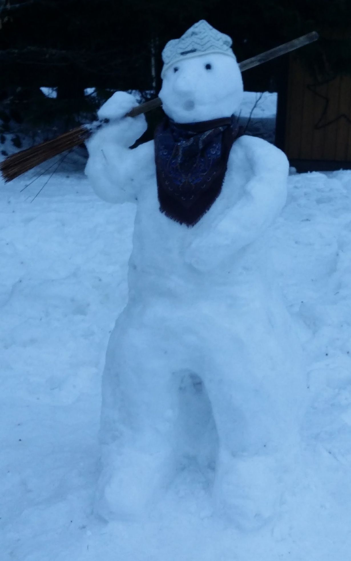 Kuvaa lumiukkosi - voit voittaa Linnea-aterinsetin Ukko lumesta 8.1.2018 klo 10:26 Siinä se lumiukko vartioi luuta olallaan. Nyt tosin jo hieman vesisateen laihduttamana.