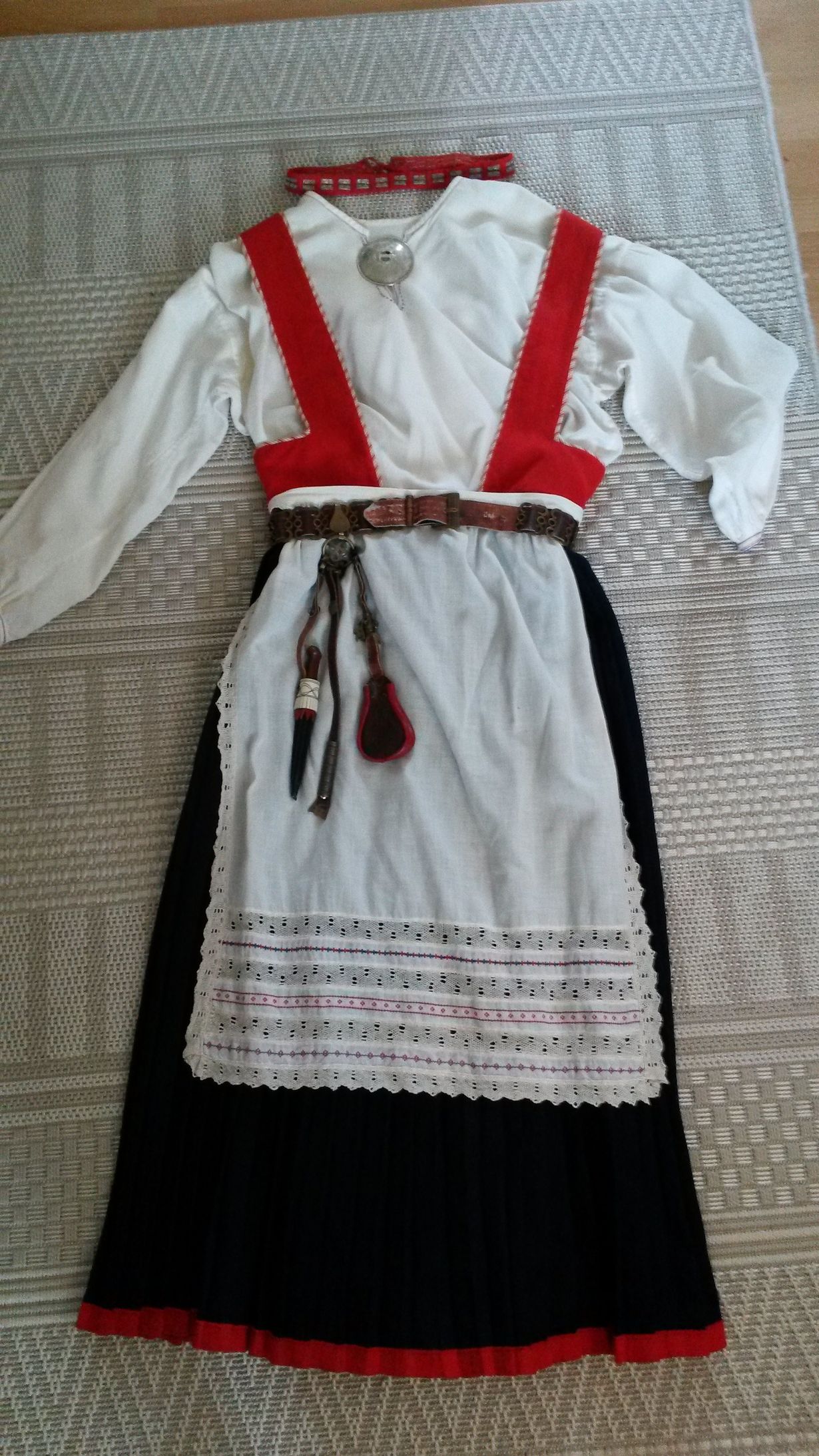 Kolmisenkymmentä vuotta sitten kuolleen tätini perintönä sain tämän Pyhäjärven (Viipurin lääni) kansallispuvun, jota olen käyttänyt monesti esim. kesähäissä, yo- juhlissa ja virallisemmissa syntymäpäiväjuhlissa. Ainakin täällä maalla ,Nivalassa, se on herättänyt ystävällistä kiinnostusta ja historiansa vuoksi on myöskin minulle rakas.