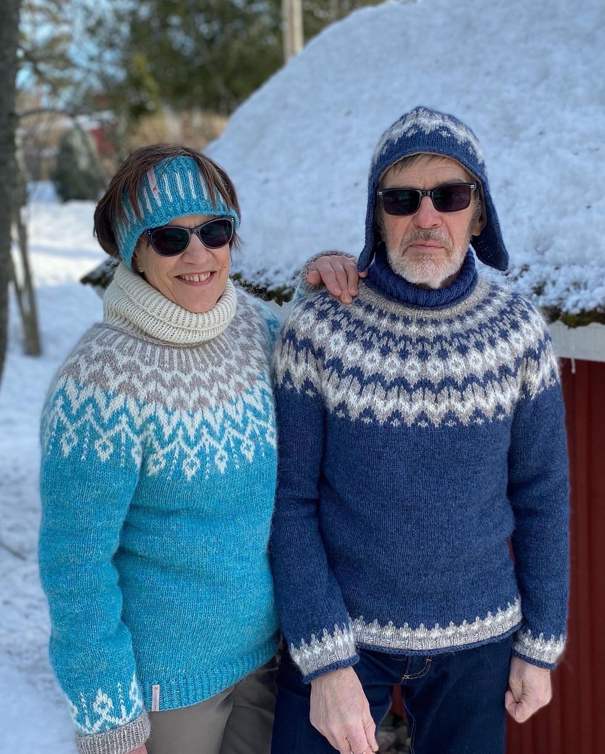 Neuloin vanhemmilleni 70-vuotislahjoiksi islantilaiset villapaidat ja asusteet. Äidilläni moderni Dreyma-malli ja isälläni perinteinen ja tunnettu Riddare. Suomeksi Unelma ja Ritari.