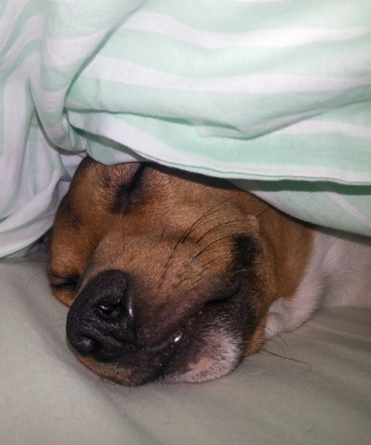 Kuvassa 5-vuotias brasilianterrieri Noppa, joka vihaa kylmää ja etsii aina sen kaikkein lämpimimmän paikan. Aamuisin Noppa jää mielellään vielä tuhisemaan peiton alle kun mamma joutuu nousemaan töihin.