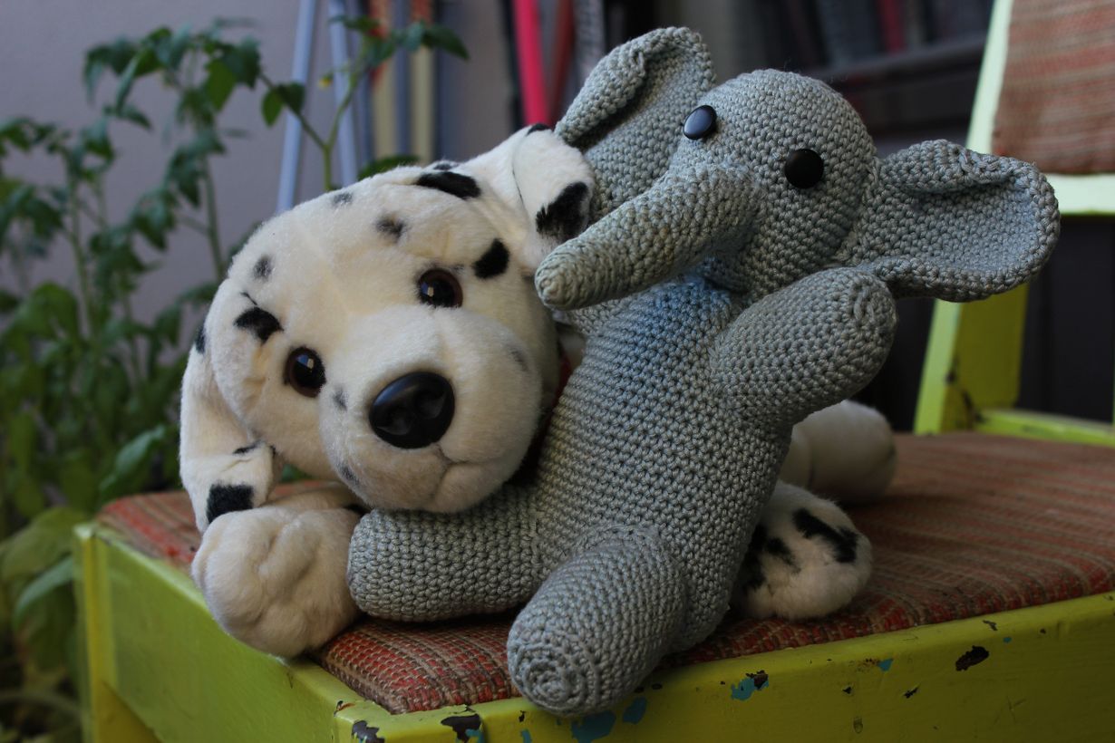 Kuvassa on itse virkkaamani norsu ja lapseltani jäänyt dalmantialaiskoira, jota pidän itselläni nyt unikaverina.