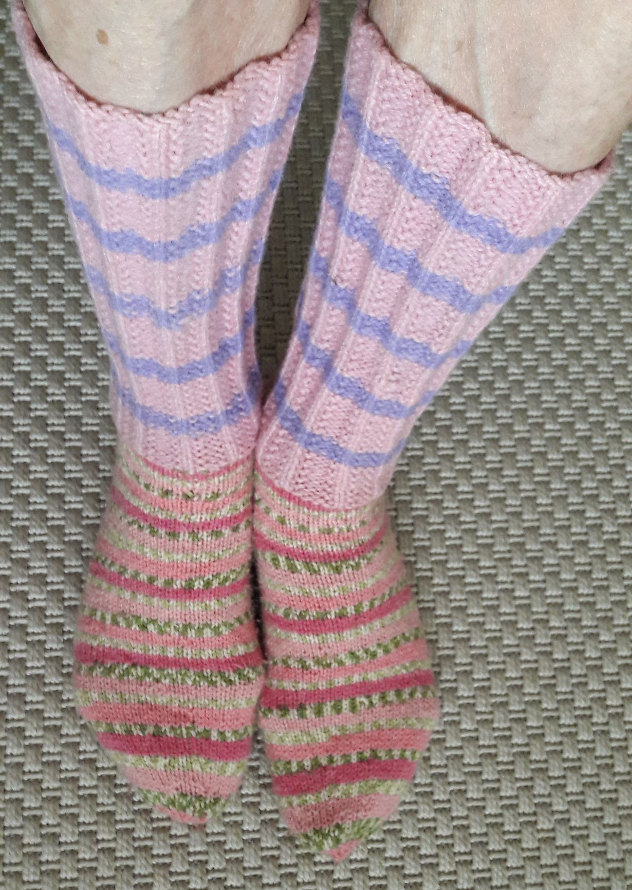Nämä sukat ovat alunperin äidin kutomat n.23 vuotta sitten. Varret ovat alkuperäiset,joissa elää äidin muisto. Teräosan on uudistanut kutojakaveri. Käytän yösukkina edelleen.