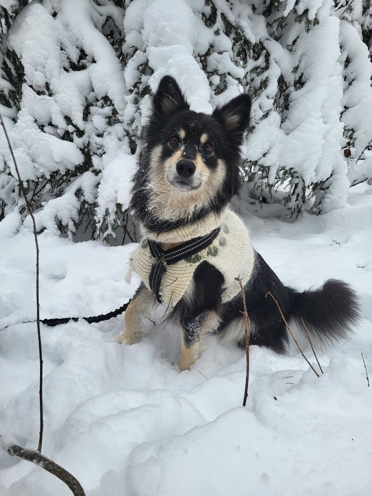 Koirani joutui leikkaukseen, jota varten kaulalta jouduttiin poistamaan karvat. Äitini kutoi paljaan kaulan suojaksi islantilais-villaliivin. Hyvin tarkeni Unna ulloilla pakkasissa!