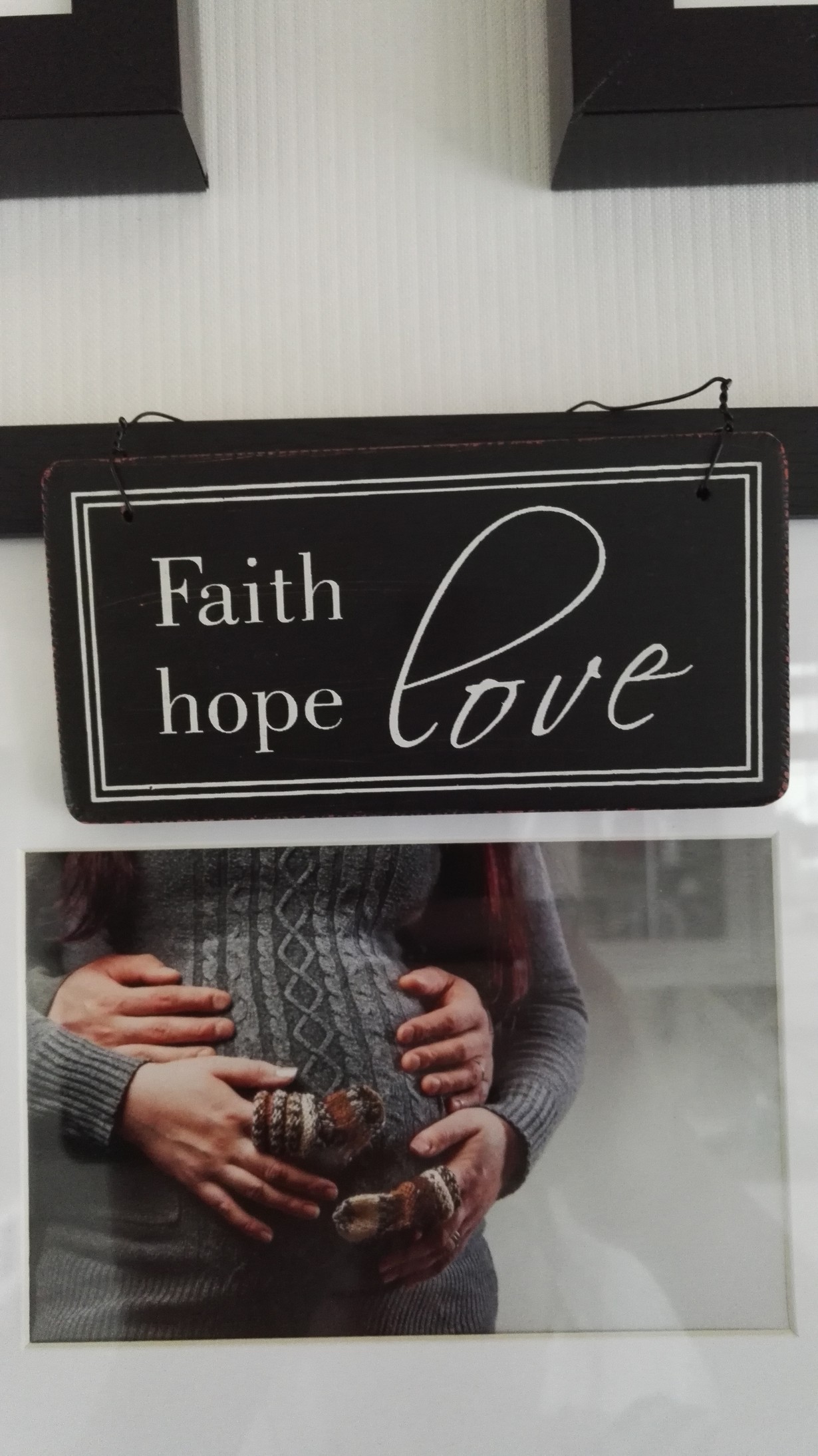 Kotimme seinällä on valokuvakollaasi jonka yllä pieni kyltti tekstillä "usko, toivo, rakkaus".