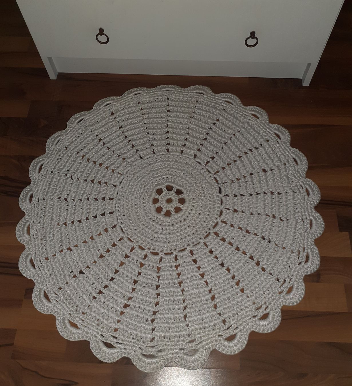 Muutettuamme uuteen kotiimme löysin sattumalta paikallisen käsityöharrastajan myynti-ilmoituksen virkatuista matoista ja sain kotiimme täydellisesti sopivan, kauneimman katseenvangitsijan!