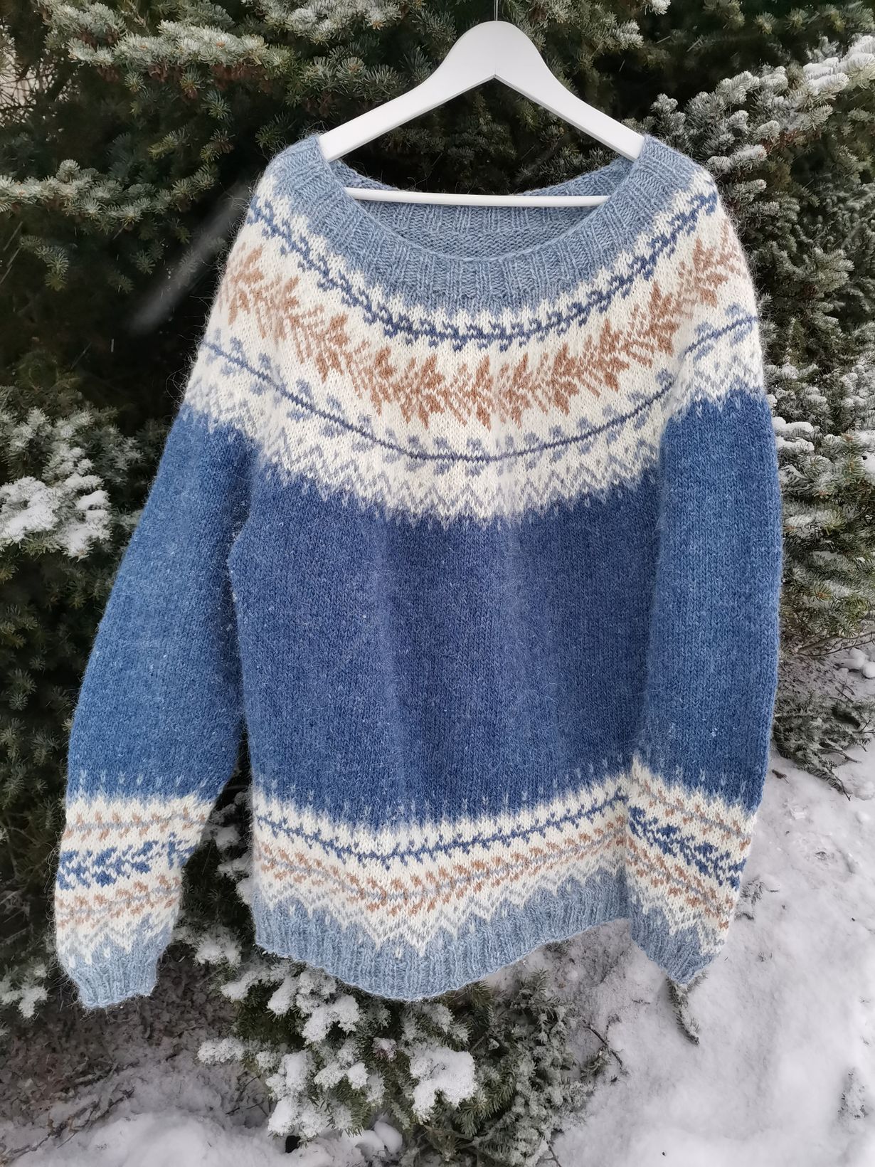 Sain juuri valmiiksi viidennen islantilaispaitani ja tämä on uusi suosikkini, Maja-villatakin ohjeesta muokattu paita. Sinisiä lankoja oli jäänyt edellisestä Telja-paidasta joten värimaailma oli selvä:)