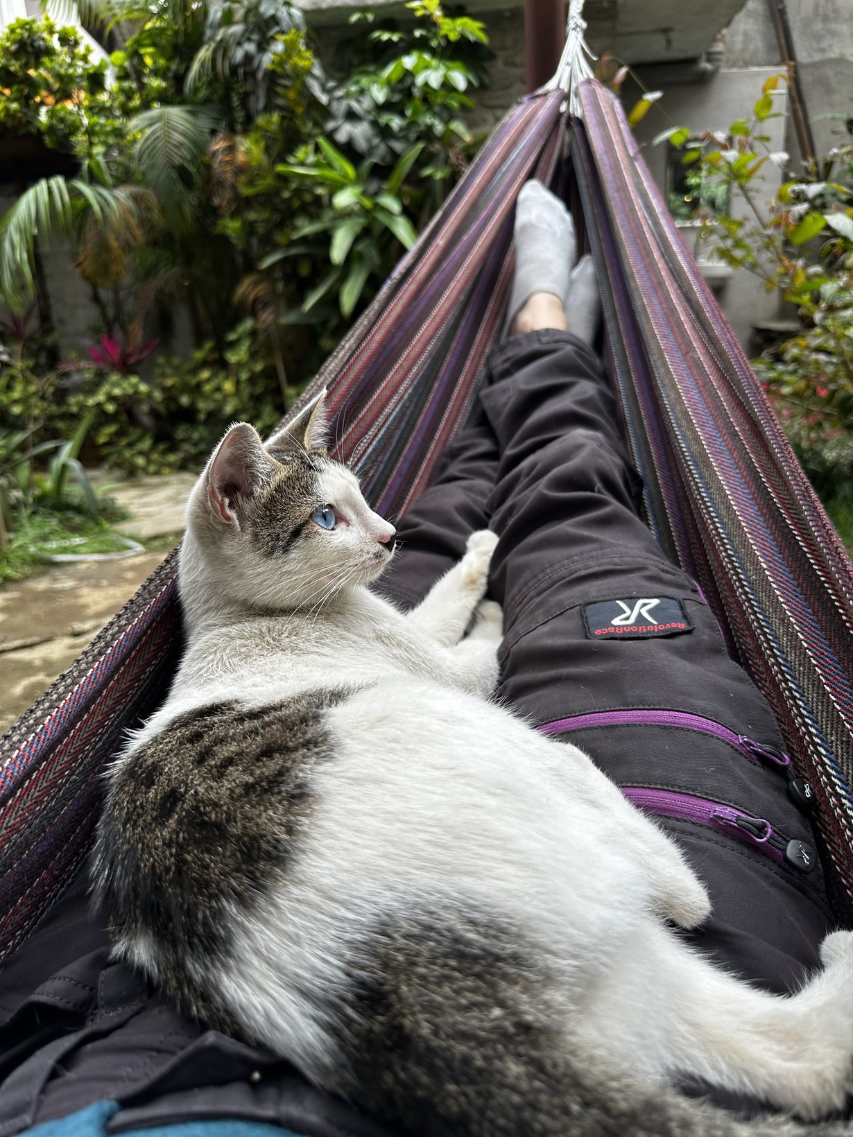 Kevätseikkailullani Nepalissa ehdin myös rentoutumaan. Ennen vuorivaellusta lepäilin majapaikkamme puutarhan riippumatossa ja yhtäkkiä sain seuraa myös majapaikan kissasta, joka hyppäsi syliini päiväunille.