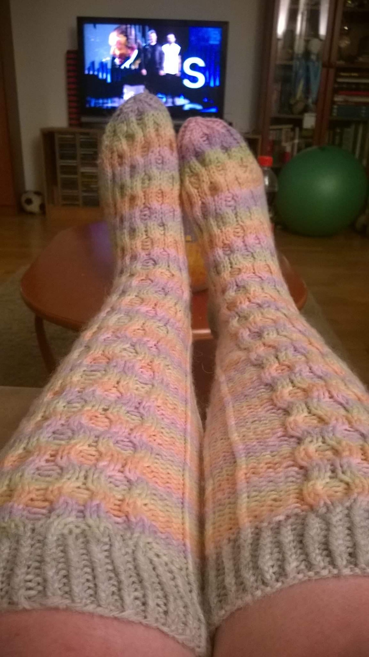 Työkaveri pyysi tekemään itselleen pitkät villasukat. Malliksi valikoitui Novitan tuolloin uutislangasta tehty malli Vaahtokarkkisukat. Koska halusin hyvin istuvat sukat, päätin tehdä itselleni malliparin. Tästä kokeilusta tuli todella ihanat ja rakkaat sukat, joita olen pitänyt kesää lukuunottamatta lähes päivittäin. Sai työkaverikin sopivat sukat ja oli tyytyväinen.