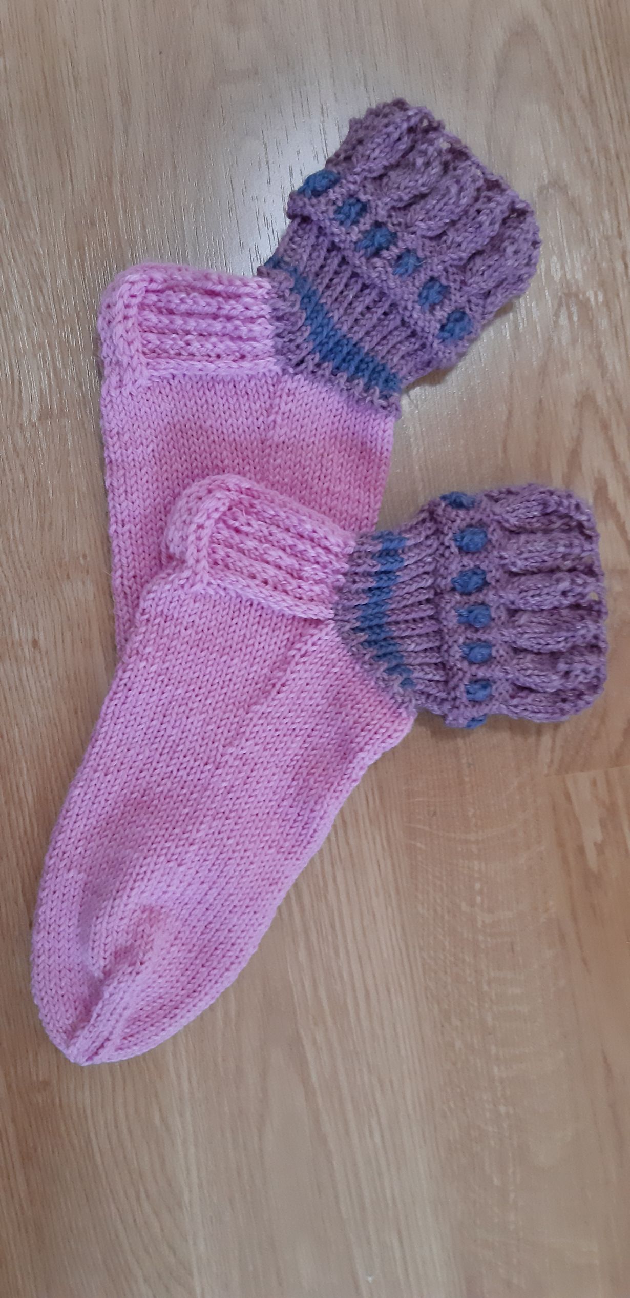 Sain ystävältä ylijäämälankoja ja neuloin kiitokseksi nämä sukat. Mallissa oli hillitymmät värit. Kun innostuin, neuloin samanlaiset myös serkulleni lahjaksi.