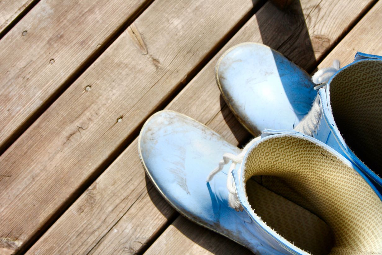 Vaaleansiniset kumpparit nyöreillä olivat vaan niin söpöt ettei niitä voinut jättää kauppaan. Niillä kelpaakin tehdä niin pihahommia kuin lähteä kauppaan!