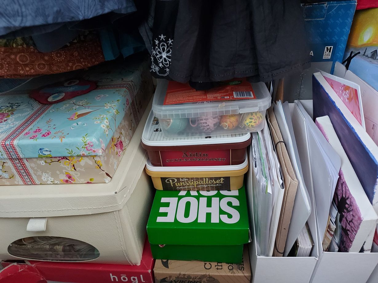 Koko yläkerta ja makuuhuone on meillä täynnä sotkupiiloja,🙈 mutta tässä nyt yksi esimerkki. Vaatekaappiinhan mahtuu tehokkaasti paljon muutakin kuin vaatteita, esim. paperitavaraa, juhlakoristeita, askartelutarvikkeita ym.