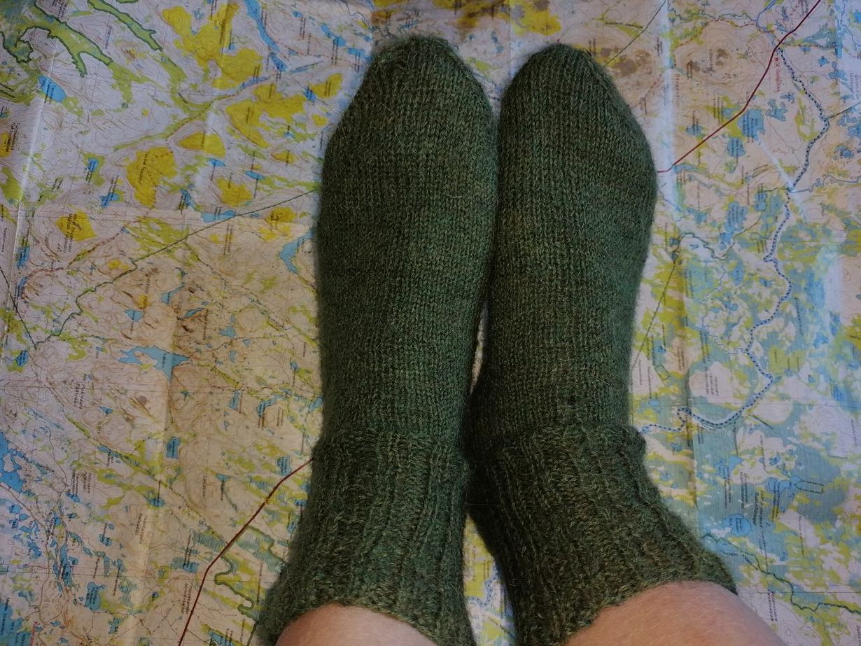 Kuvassa ohuesta villalangasta neulotut vaellussukat. Vaeltaessa teltassa nukkuessani jalkojani aina palelsi mutta eipä palele enää kun on nämä sukat jalassa.