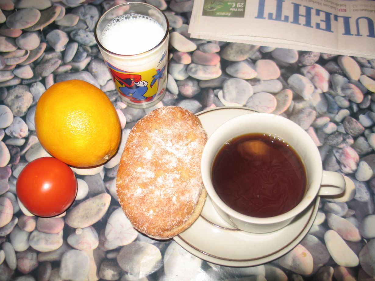 Kahvi, maito, leipä, appelsiini ja tomatti