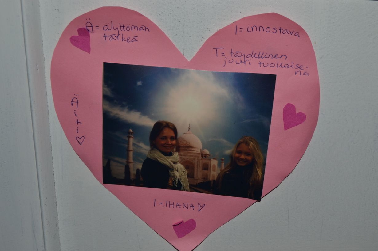 Kortissa luki: "Äiti olet mulle niin rakas, että voisin mennä sun kanssa vaikka Intiaan ja takas"... Kuva on otettu viime vuonna matkamessuilta, joissa olin kortin antajan, kuvassa näkyvän tyttäreni Kertun, kanssa. Kerttu onkin loistavaa matkaseuraa, ties vaikka menisimmekin vielä joskus yhdessä Intiaan ja takas! Tämä kortti on vaatekaappini ovessa, se muistuttaa aina ihanasta esikoisestani ja yhteisten hetkien tärkeydestä.