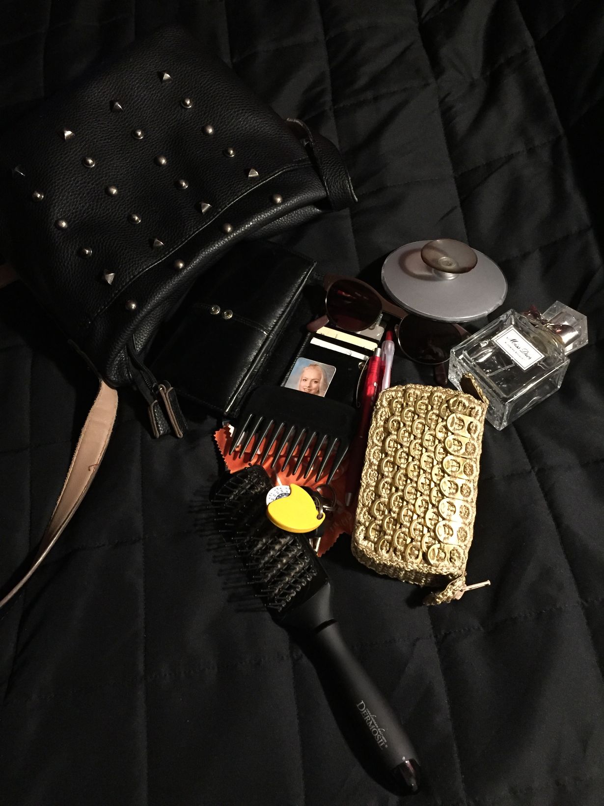 Käsilaukussa nykyään vain ihan tarpeellista tavaraa, ystäväni valmistama meikkipussi, aurinkolasit, kukkaro, missä tyttären tyttären kuva aina matkassa. Silmälasien puhdistusliina, kampa, harja ja yksi UPS tikku. Kännykkä on tietysti myös mukana, mutta ei päässyt kuvaan vaan oli kuvaajana.