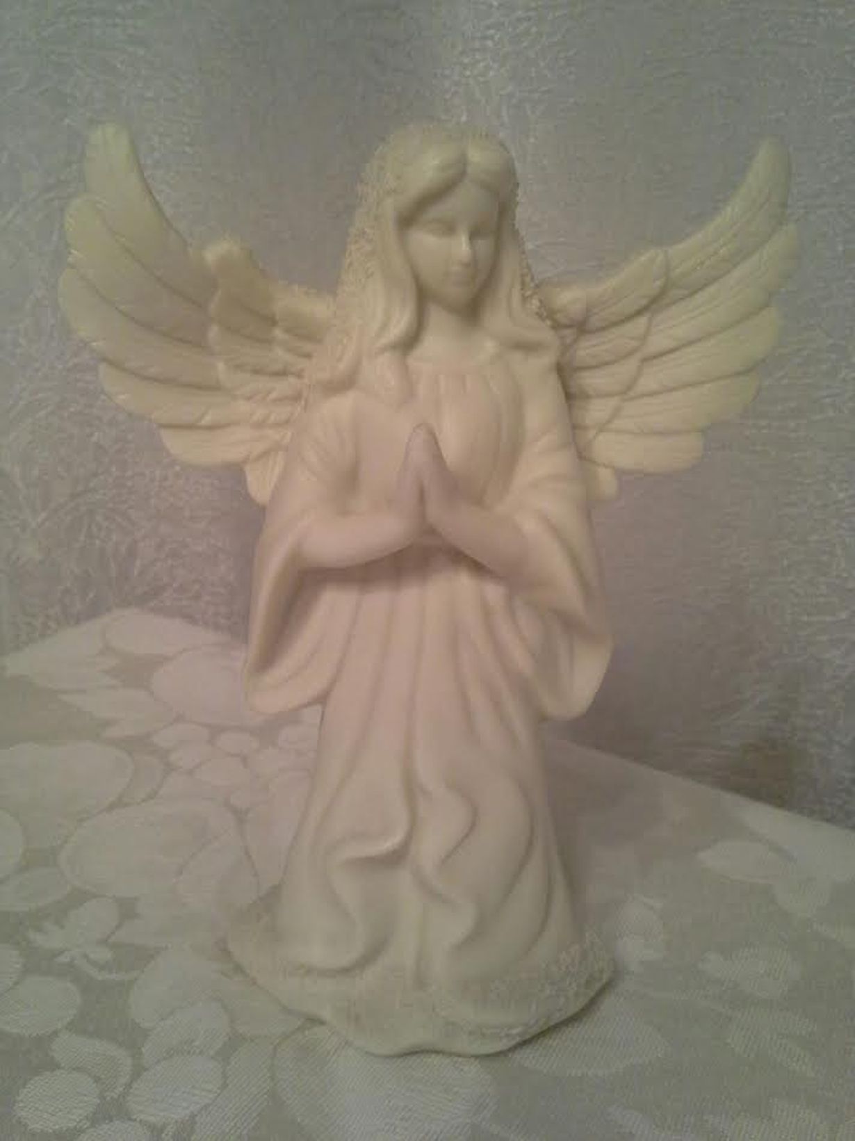 Poisnukkuneiden läheisten valokuvien vierellä koristaa olohuoneen pöytää valkea enkeli.