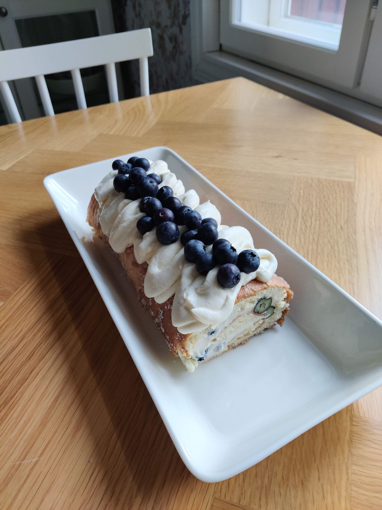 Ensimmäinen leivonnainen, jota tein nykyiselle aviomiehelleni, oli valkosuklaalla ja pensasmustikoilla täytetty täytekakku. Sitä muisteltiin sitten joka kerta kun leivoin jotain - mikään ei kuulemma vetänyt sille vertoja. Leivoin hänelle sitten viime vuonna hänen ensimmäisenä isänpäivänään samoilla mauilla täytettyä kääretorttua. Kuulemma maistui vieläkin paremmalta!