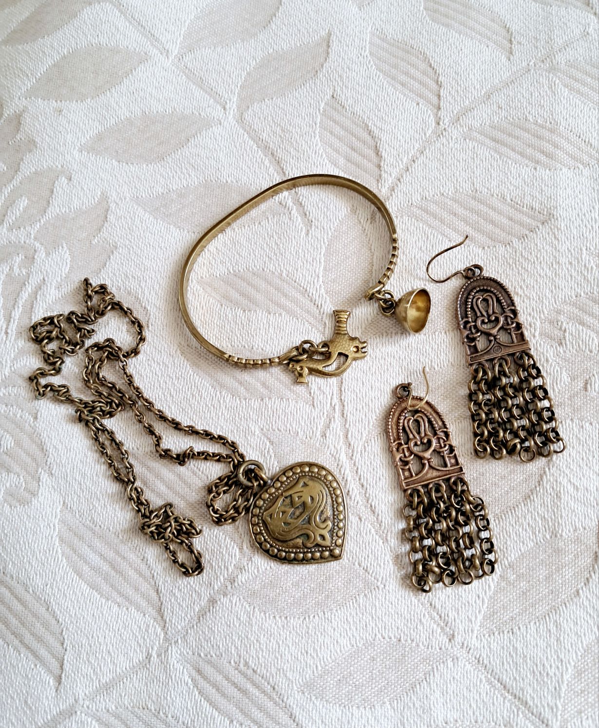 Kuvassa isoisoäidin Kalevala kaulakoru ja isoäidin Kalevala rannekoru ja korvakorut.