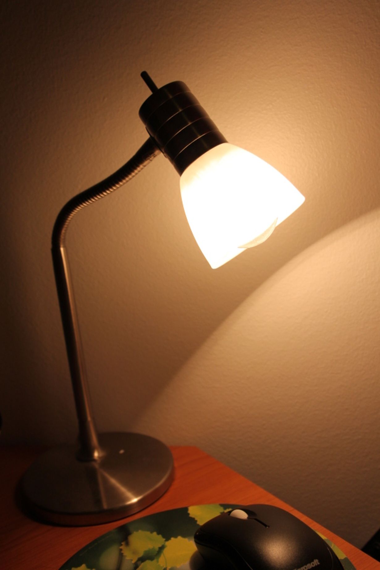 Tietokoneemme vanha näppis teki tenän ja siitä alkoi kulua kirjaimet pois. Tietokone on huoneen nurkassa, joten valoa piti saada, tai tulee kirjoitetuksi paljon puuta heinää. Ostin lampun siis ihan vain ja ainoastaan käytännöllisessä mielessä, mutta onhan tuosta silmäniloakin.
