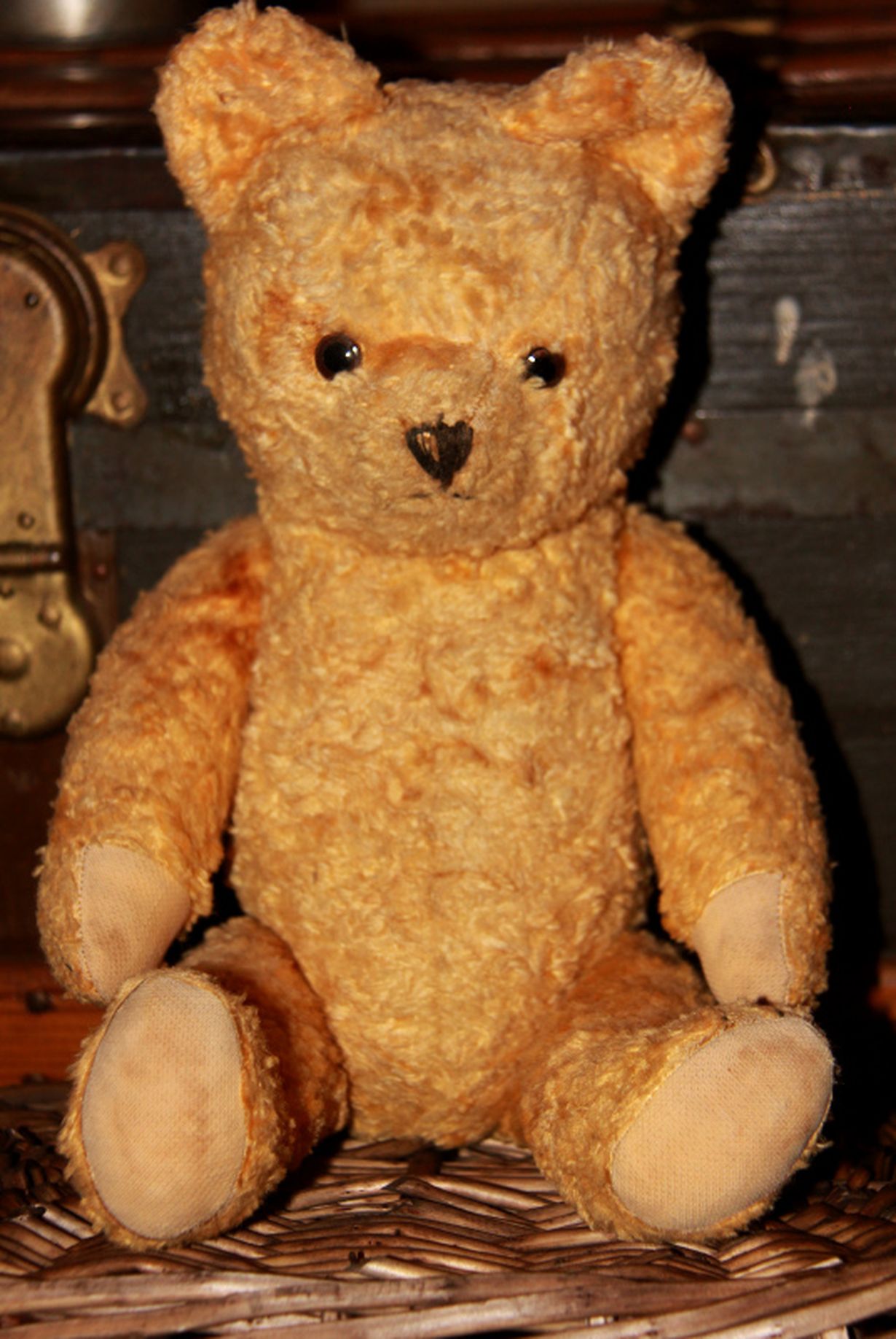 Tämä nalle on itse asiassa mieheni vanha lelu. On ihmeen hyvin säilynyt, vaikka ikää on n. 50 v. Nalle istuskelee olohuoneemme parhaalla paikalla vanhan puusohvan nurkassa ihmetellen siellä maailman menoa. Itselläni on myös nalleja,omatekoisia kursseilla tehtyjä "antiikkinalleja". Ovat nekin hienoja, mutta kyllä näissä oikeasti vanhoissa leluissa on sitä "jotain".