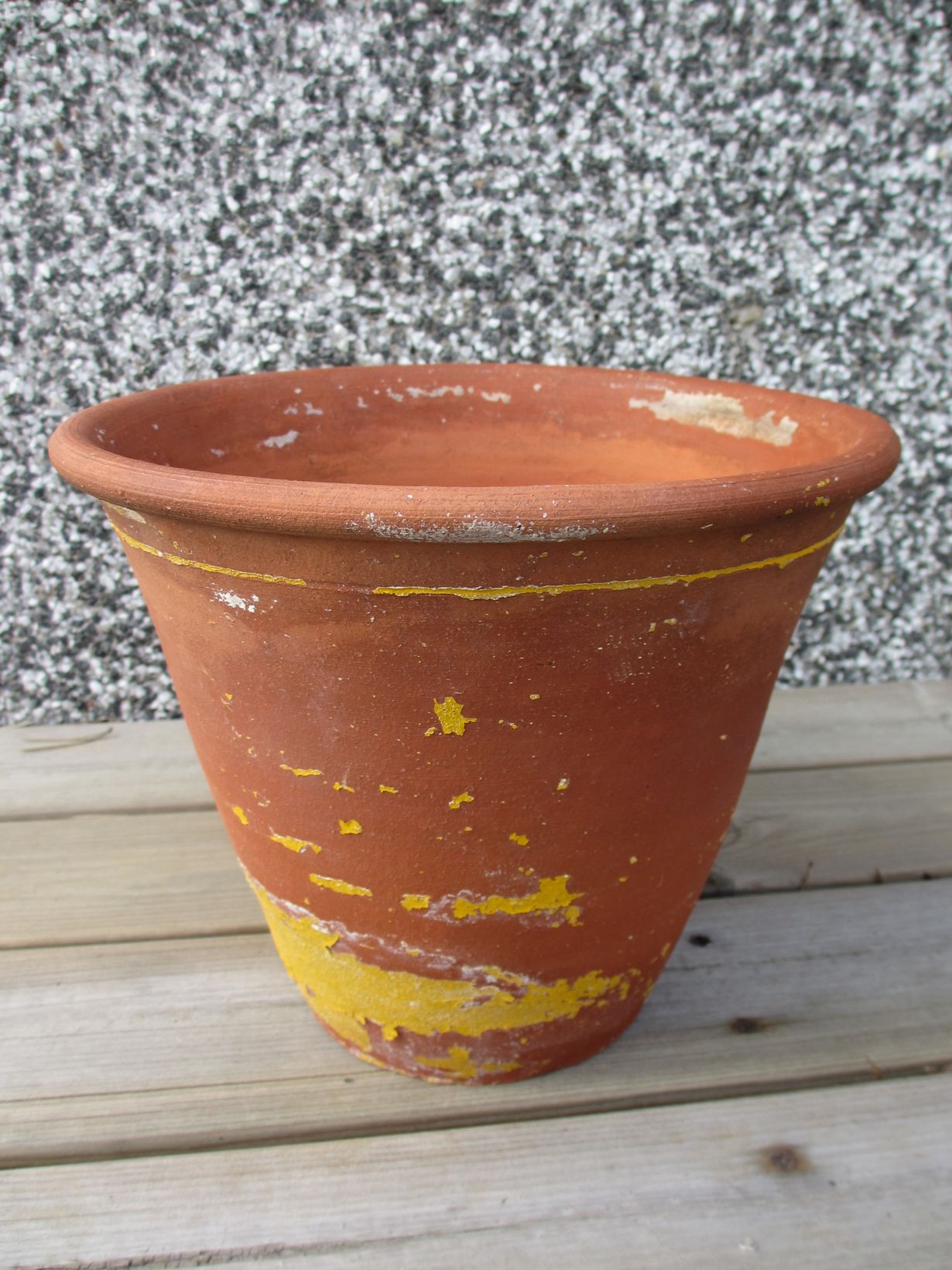 Isäni mummulasta löytynyt kukkaruukku odottelee kesän kukkasia. Ruukku on oletettavasti maalattu keltaisella jo vuosikymmeniä sitten ja on nykyisin kauniisti ajan patinoima.