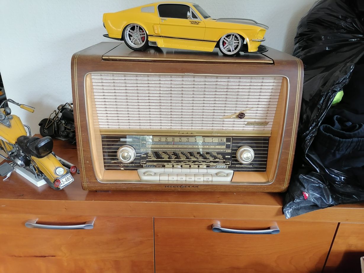 Tämä vanha radio/levysoitin kuului nykyisen kotimme edellisille omistajille. Ihastuin soittimen vanhaan ulkonäköön ja sanoinkin heille, että jos eivät halua viedä soitinta mukanaan pois muuttaessa, voivat jättää sen meille. Oli iloinen yllätys kun soitin oli jätetty taloon kun muutimme sinne.