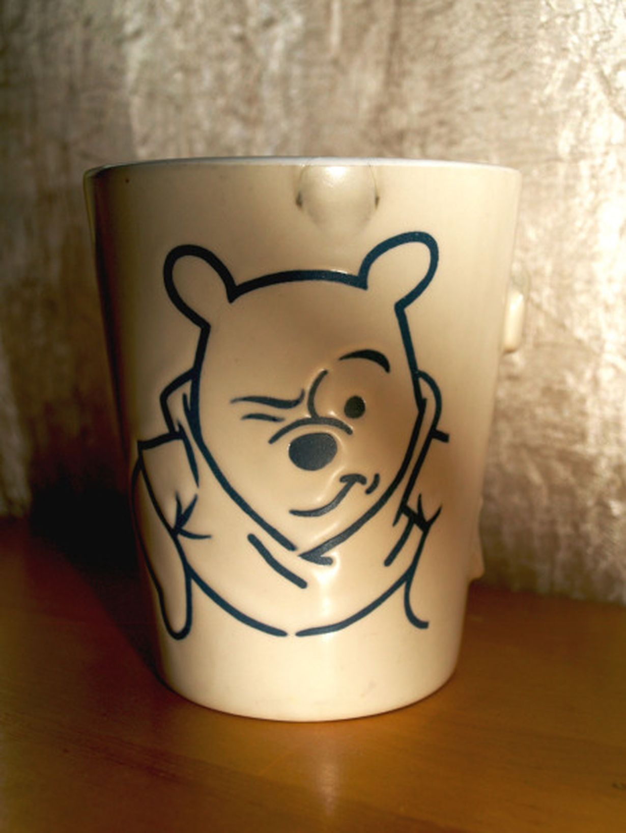 Kun muutin useita vuosia sitten Järvenpäähän opiskelemaan, sain lahjaksi neljä suurta nalle puh mukia äidiltäni. Tämä yksi on seurannut minua läpi viiden muuton, ja neljän kaupungin nykyiseen kotiini Riihimäelle. Matkan aikana on tullut jälkiä, kolhuja ja on mukin sarvikin jonnekkin kadonnut. Siitä huolimatta, aamukahvini aina juon nalle puhin tuiman tuijotuksen saattamana. Tämän rakkaampaa, ja muistorikkaampaa mukia saa hakea !