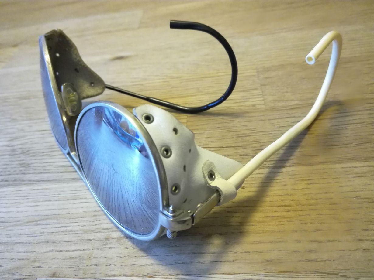 Vanhat aurinkolasit, sivuissa nahkaiset häikäisynsuojat. Harmi kun ei voi käyttää kun nykyään tarvitsen linssit vahvuuksilla.